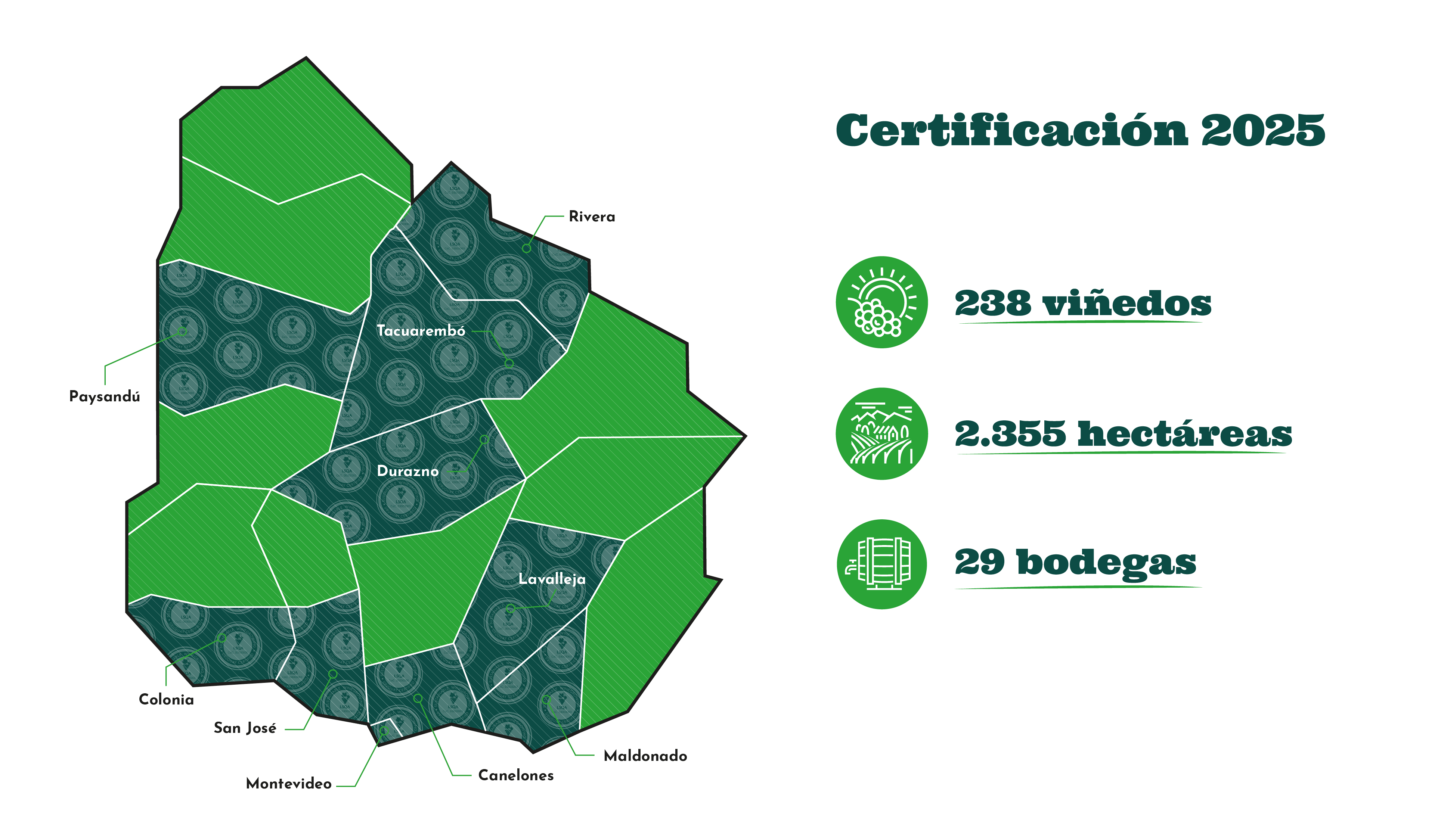 Los viñedos certificados reciben el sello Uruguay Sustainable Winegrowing, que distingue a los productores comprometidos con la viticultura sustentable.